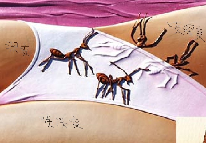 現在大多數廠家都會使用噴槍著色,皮雕噴涂漸變有2種方式,由淺往深過渡叫淺變。主要是稀釋劑的配比比列了的。由深往淺變叫深變。噴筆由于散色很均勻所以相對比較容易掌握的。但也需要一定的練習了。一般大面積淺變多。深變少,但人物動物肌肉感多為深變,就是用噴筆由最深色處開始往淺色區輕掃。下面是圖片