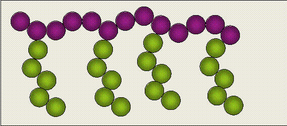 圖1:相同組成但結構不同的聚合物:a)統計分布的共聚物b) AB嵌段共聚物 |