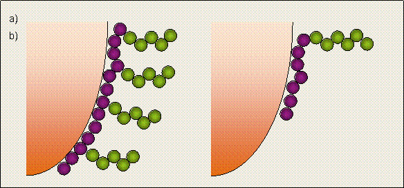 聚合物型分散劑的效率與分子量、單體選擇以及單體單元在聚合物上的排布關系密切[1-3]。當錨定基團之間的距離很近時,分散劑與顏料表面的固定效果更好。圖1顯示的是組成相同,但結構不同的聚合物:純統計學分布即單體在聚合物中呈隨機分布的聚合物(a);單體積聚于聚合物一端的嵌段共聚物(b)。嵌段共聚物由錨定和穩(wěn)定單體組成,因此組成了高效的潤濕分散劑。
