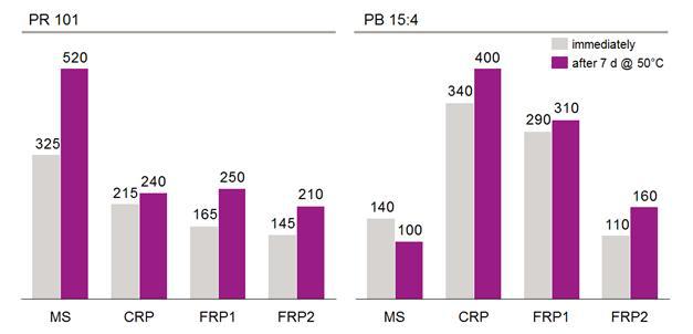 圖4顯示的是儲存前后顏料濃縮漿的動態(tài)粘度。研究所用的分散劑(CRP,FRP1,FRP2)均有良好穩(wěn)定的粘度性能。測量結果上不同的產品之間并無明顯區(qū)別。從趨勢上看,優(yōu)化的潤濕分散劑(FRP2)的降粘效果更為明顯。采用市場標準產品(MS)制得的藍顏料濃縮漿儲存后粘度有所下降。這說明顏料分散后才被潤濕,顯示潤濕效果更慢。而儲存后的含MS的PR 101濃縮漿則產生了負面的增粘效果。