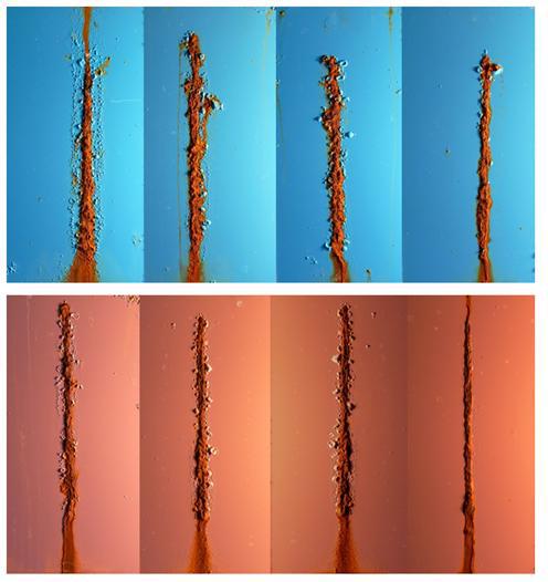圖5:鹽霧測試結果(DIN EN ISO 9227;1200 h)(體系:基于顏料PB15:4(上)和PR 101(下)的水性雙組份聚氨酯涂料;基材:鐵板;分散劑:從左至右為MS,CRP,FRP1,FRP2)