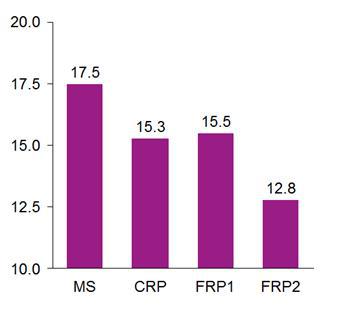表2列出的是本實驗所測試產品的顏色性能,可以看到性能接近,但是FRP2的著色力和相容性(霧影)更好一些。和市場標準產品(MS)相比,含測試產品(CRP,FRP1,FRP2)的有機藍顏料展現出稍高的著色力。而對于無機紅顏料,和市場標準產品相比相容性更好,著色力則稍高(高5%)。