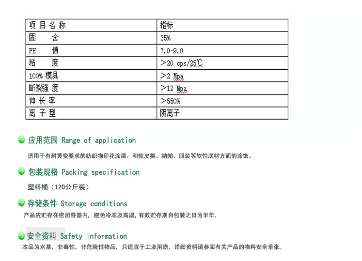 - 用途:適用于有耐黃變要求的紡織物印花涂層,和軟皮類、納帕、服裝等軟性底材方面的涂飾。