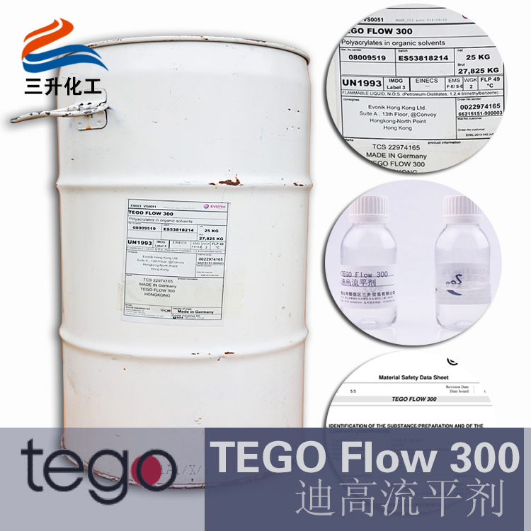 以下為三升貿易暢銷產品,贏創德固賽迪高助劑的TEGO Flow 300 流平劑,用于溶劑型配方中,因為有非常好的流動性和清漆中透明性,適合用于汽車漆、工業涂料、罐聽涂料、輻射固化涂料。