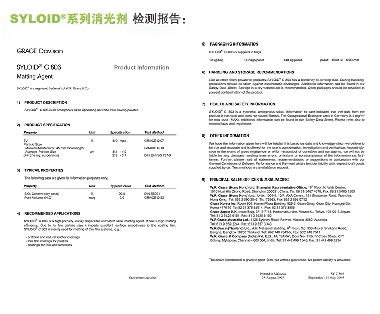* 表示必填采購:格雷斯SYLOID C803消光劑